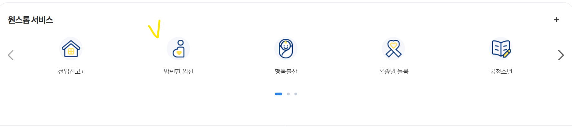 1. 정부 24시 홈피 첫 화면 아래부분을 보시면 원스톱 서비스가 있습니다. 노란색 체크가 되어있는 맘편한 임신이라는 글자 보이시나요 . 클릭합니다.